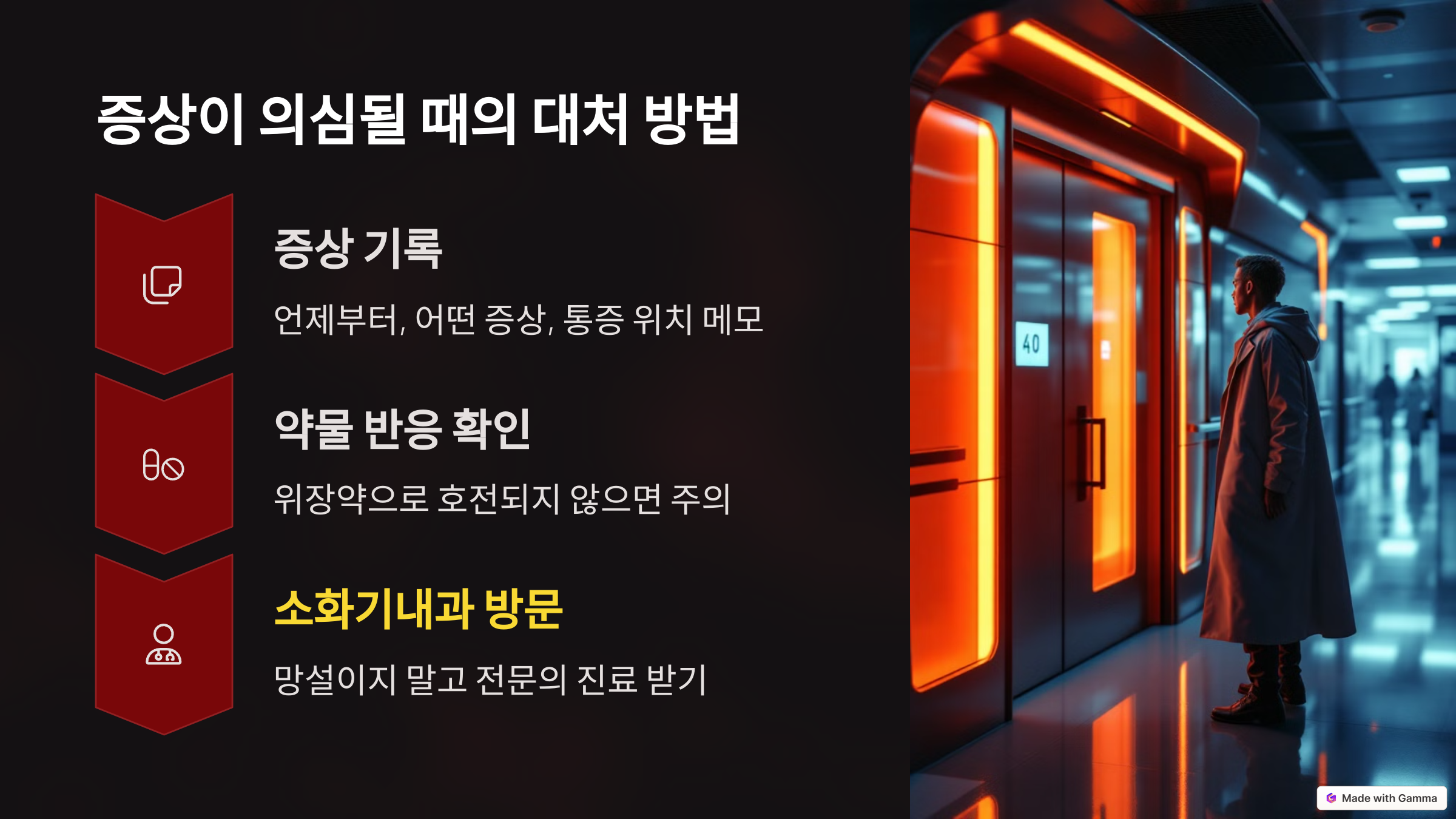 그리고 위장약으로도 호전되지 않는다면 망설이지 말고 소화기내과 진료를 받아야 해요.