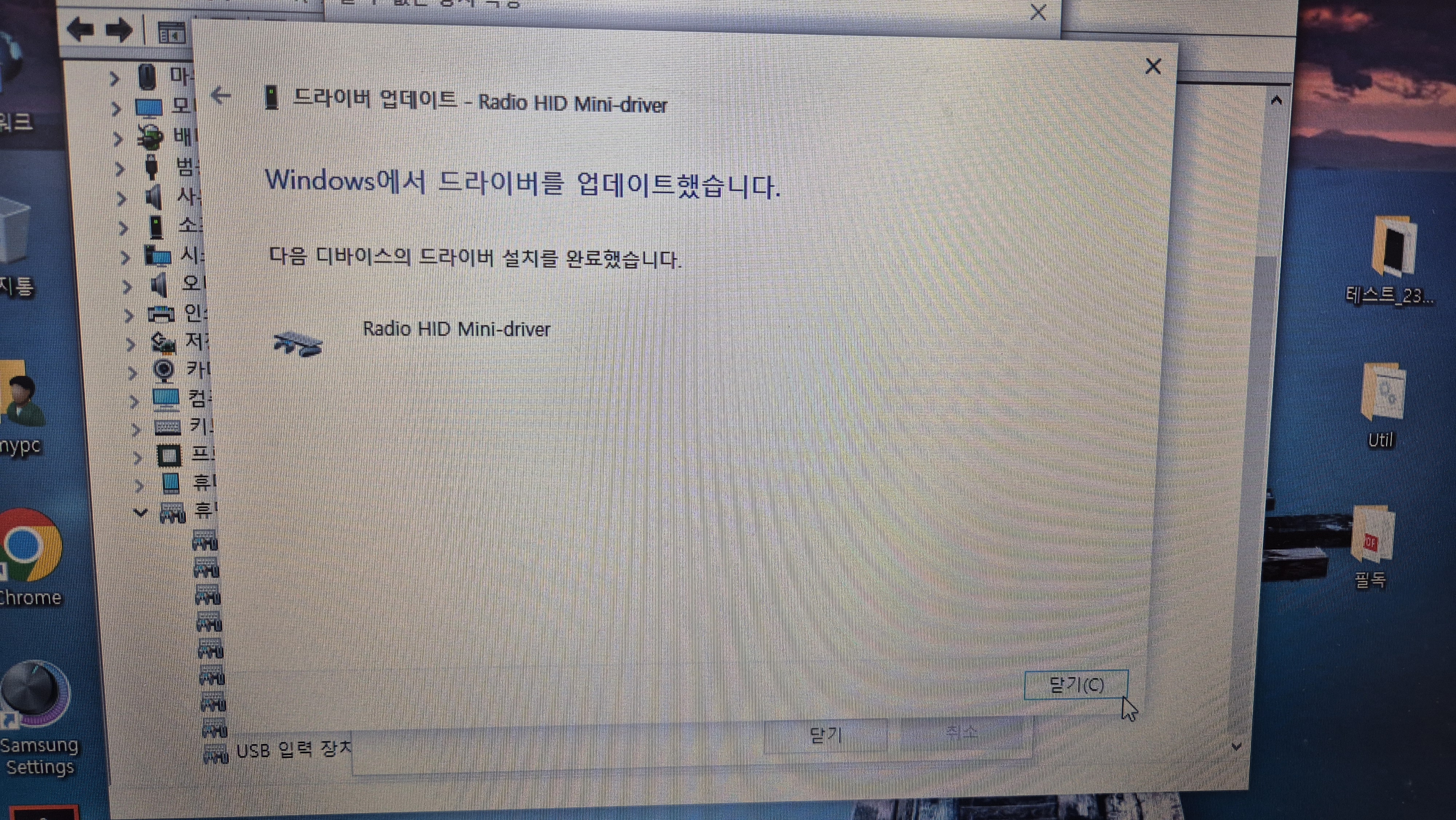 - 설치가 성공적으로 완료되면 아래와 같은 메시지가 표시됩니다. (Radio HID Mini-driver)