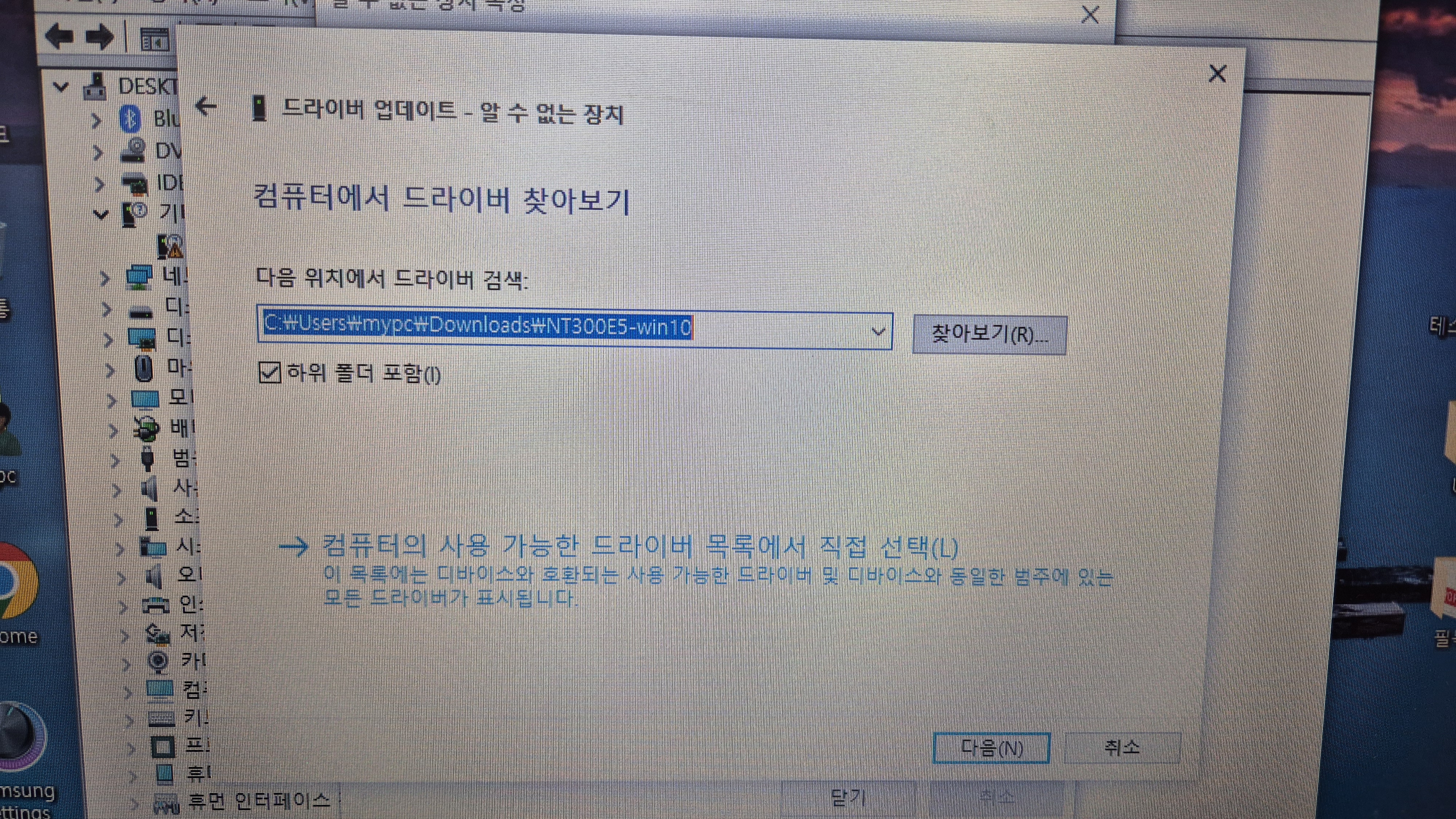 대부분의 드라이버는 Windows 업데이트를 통해 자동 설치되지만, 간혹 위와 같이
