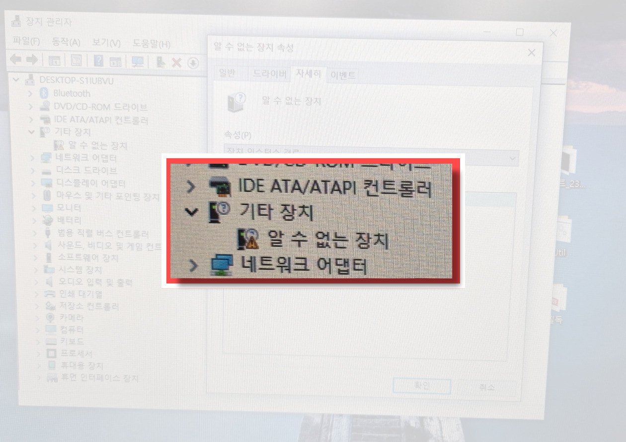 1.  '알 수 없는 장치' 항목을 더블클릭