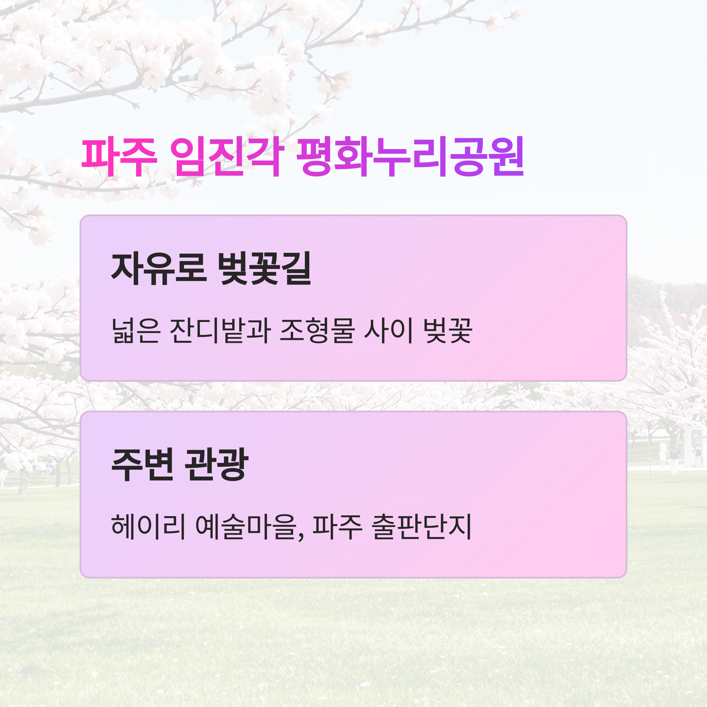 넓은 잔디밭과 조형물 사이로 만개한 벚꽃이 인상적인 공원입니다.