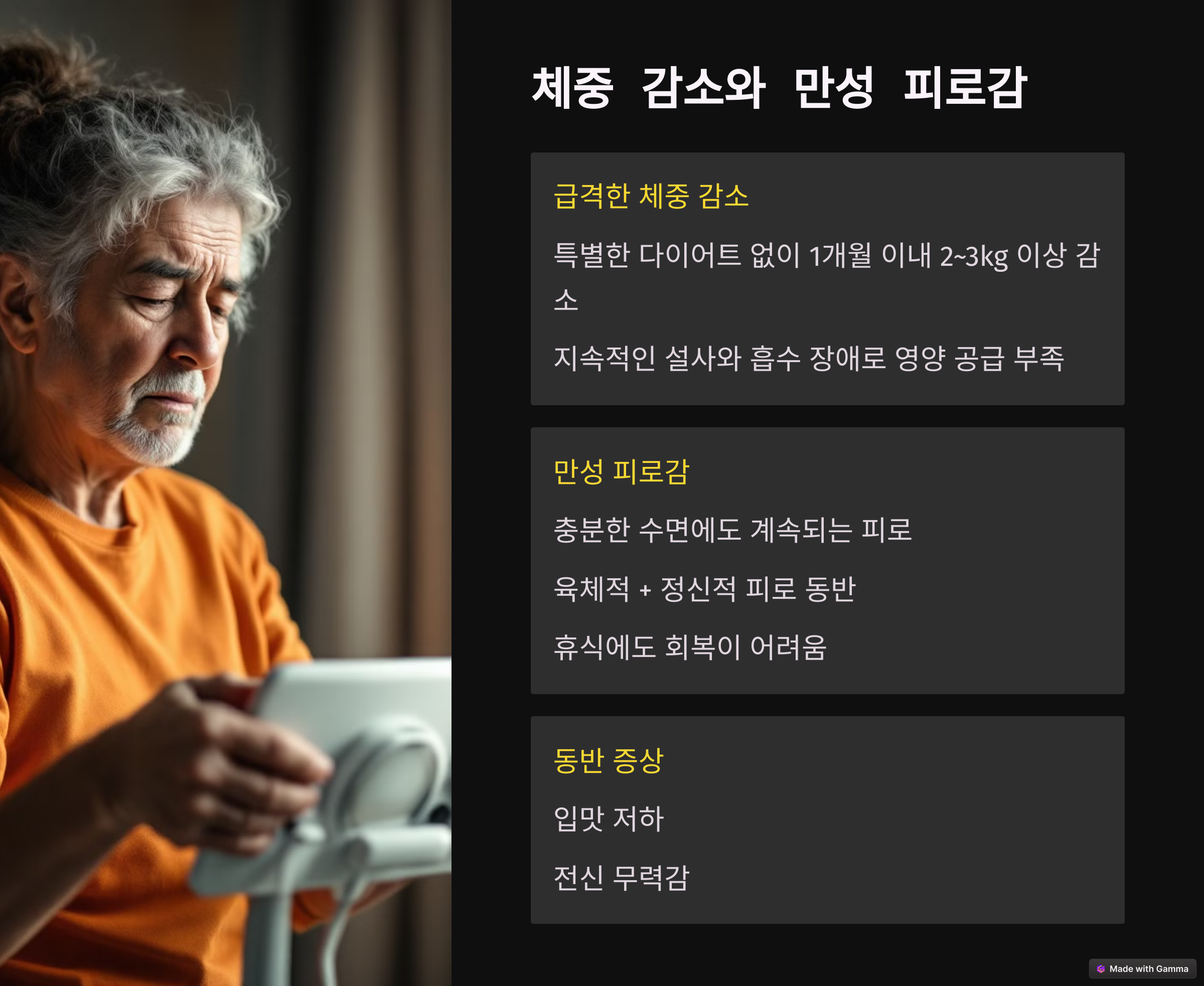 • 체중 변화: 1개월 이내 2~4kg 이상 갑작 스럽게 체중이 감소함