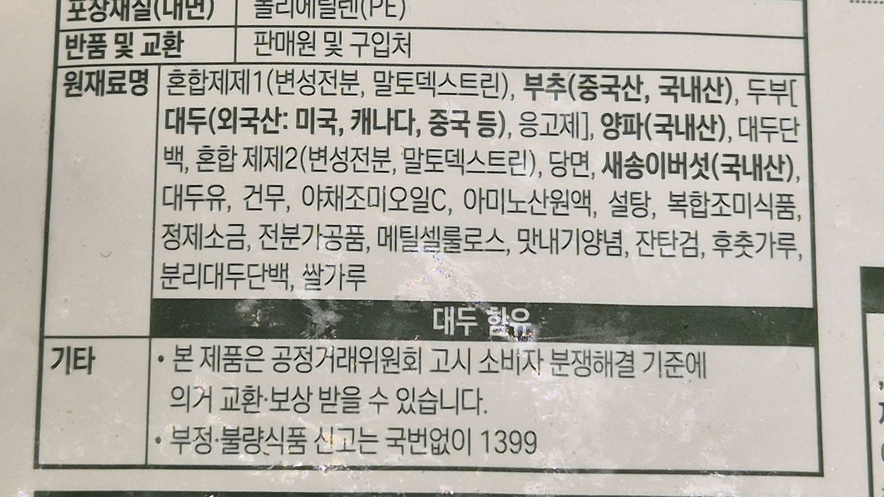 두부[대두(외국산: 미국, 캐나다, 중국 등), 응고제] / 양파(국내산) / 대두단백 / 혼합제제2(변성전분, 말토덱스트린) / 당면 / 새송이버섯(국내산) / 대두유 / 건무 / 야채조미오일C / 아미노산원액 / 설탕 / 복합조미식품 / 정제소금 / 전분가공품 / 메틸셀룰로스 / 맛내기양념 / 잔탄검 / 후춧가루 / 분리대두단백 / 쌀가루
