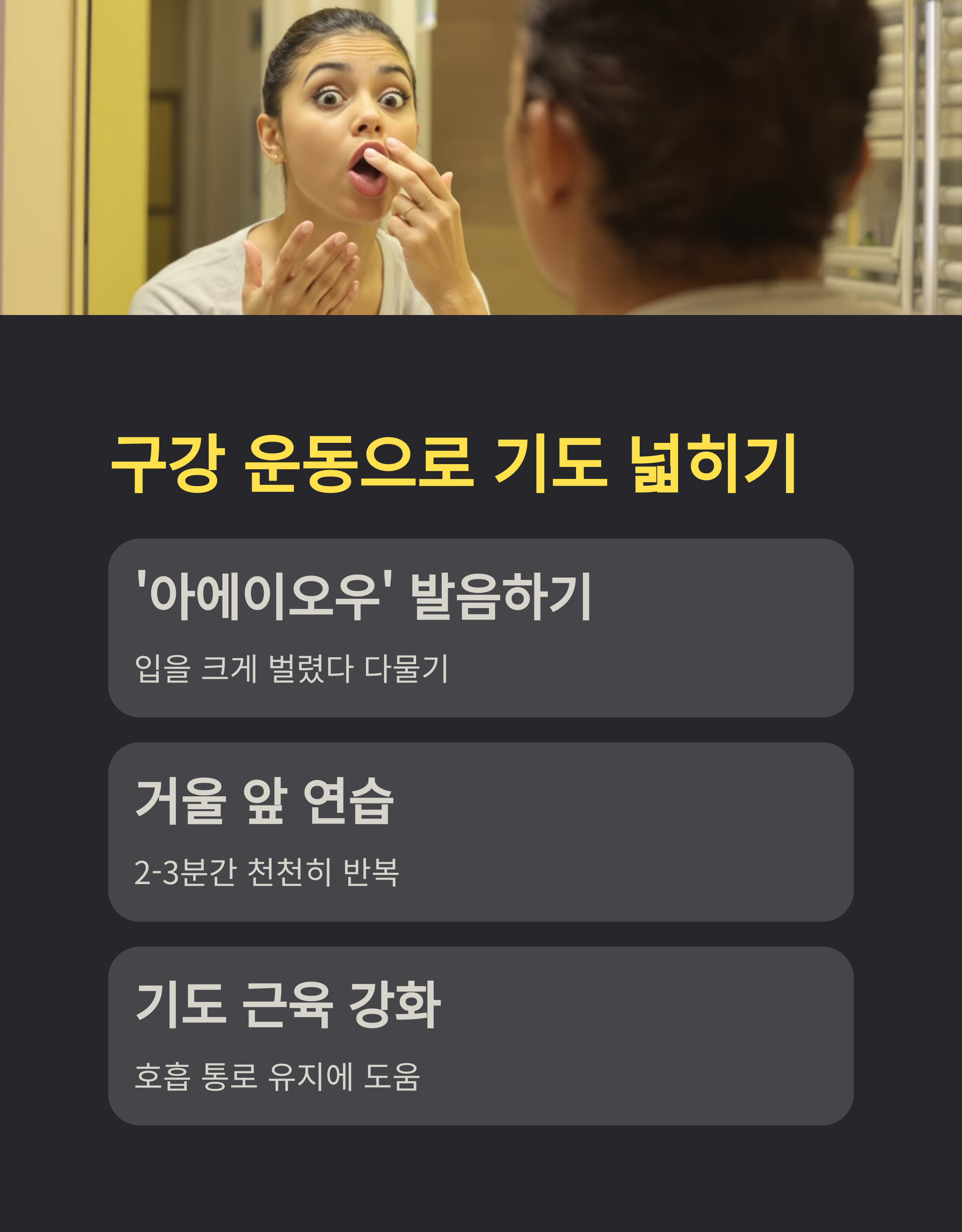 처음엔 민망하지만, 습관이 되면 기도 주변 근육이 강해져 호흡 통로가 유지되기 쉬워집니다.