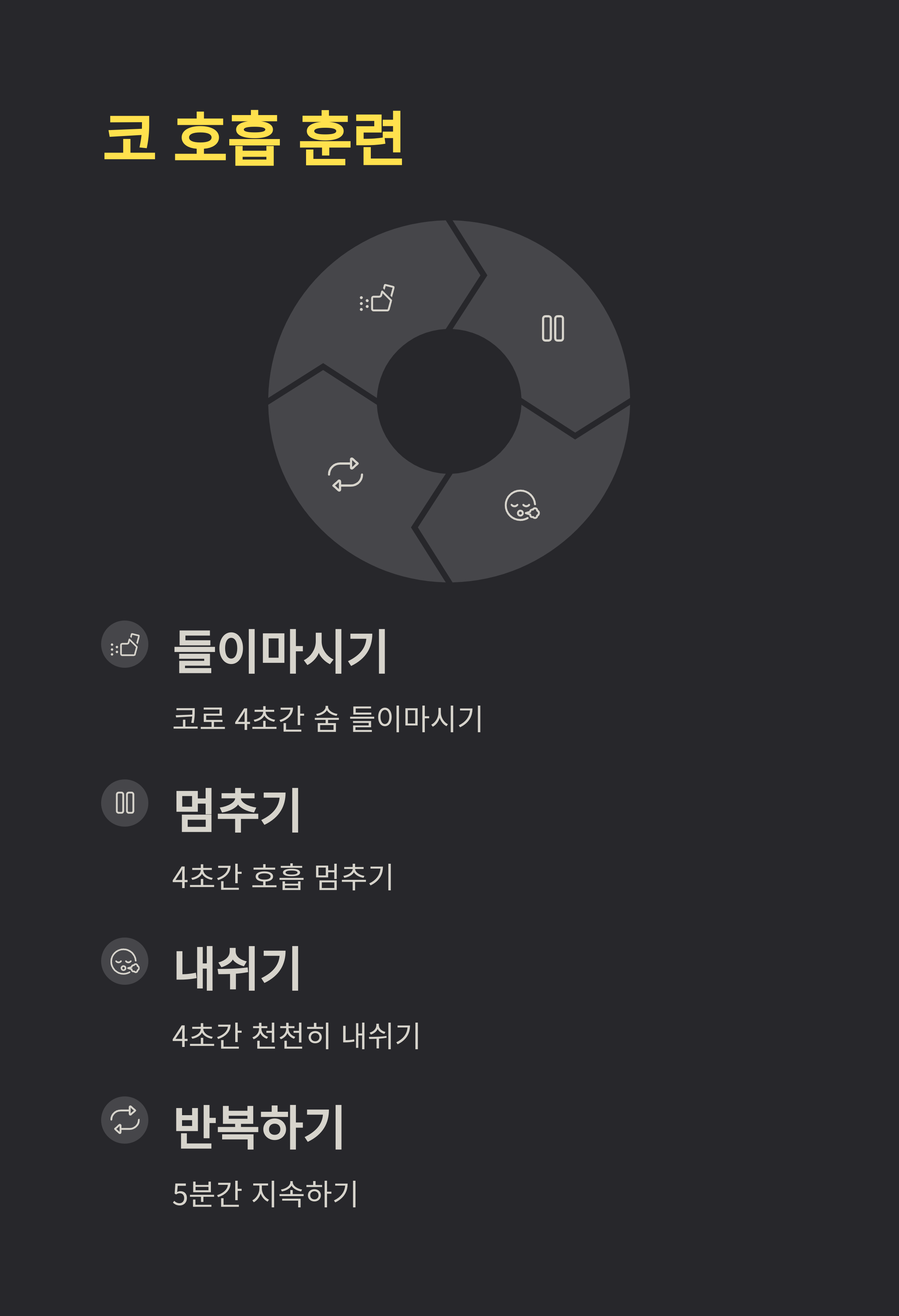 입을 닫고 4초 들이마시고, 4초 멈췄다가 4초 내쉬는 호흡법은 집중력도 높이고 수면에도 도움이 됩니다.