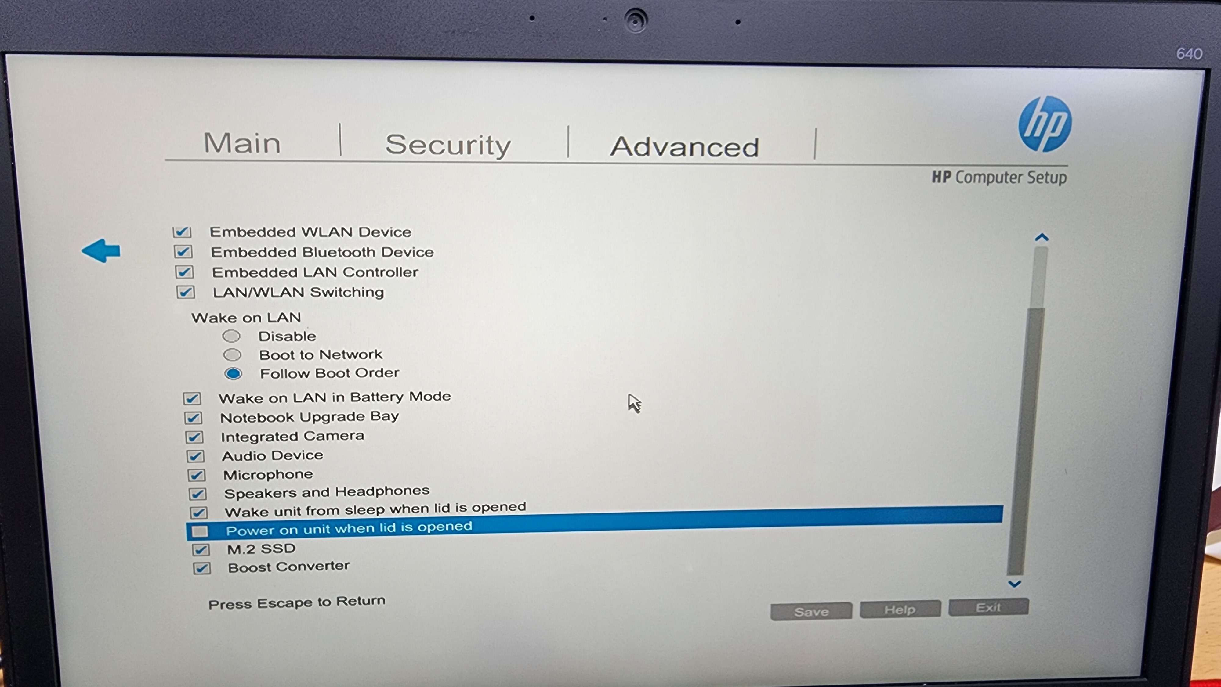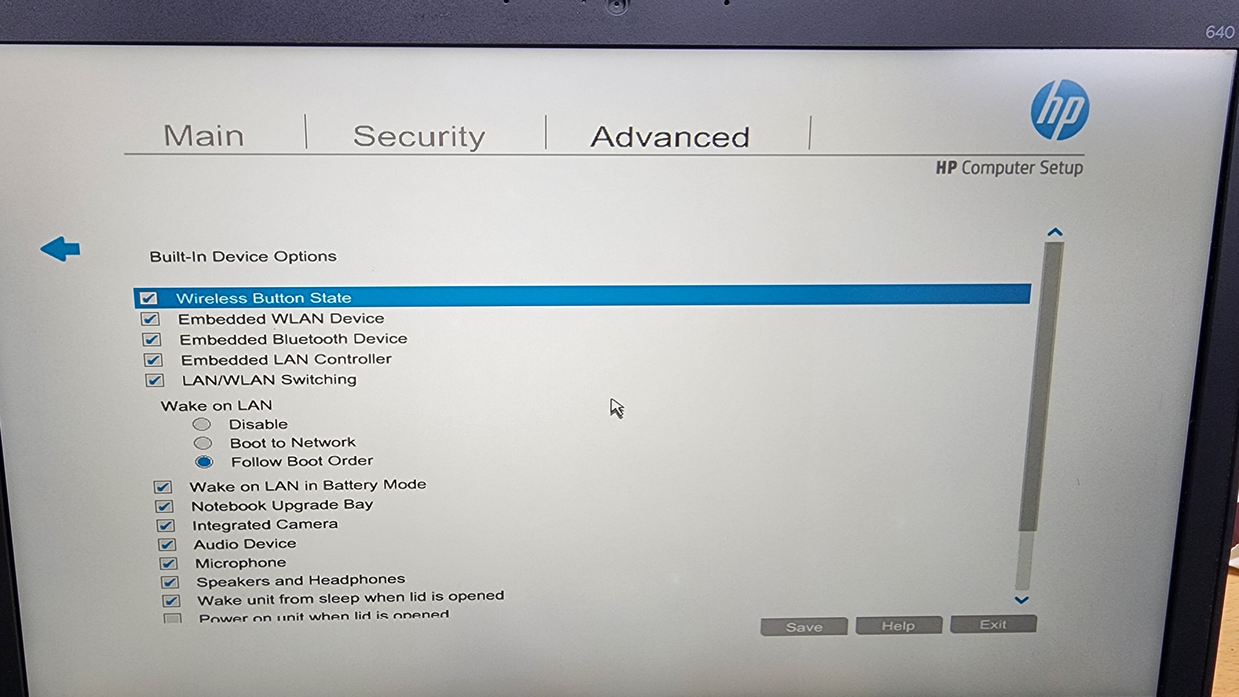 전원 ON → F10누름 → BIOS 접근 → Advanced 선택 → Built-in Device Options 선택